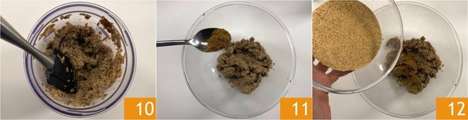 Acione o processador para triturar os cogumelos finamente 10. Despeje o purê em uma tigela, depois adicione o cominho 11 e a farinha de rosca 12.