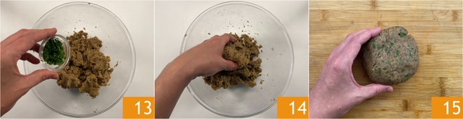 Tempere com uma pitada de sal, pimenta e salsinha picada 13. Amasse com as mãos 14 até obter uma massa macia e homogênea 15.