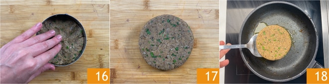 Use um aro de metal do mesmo diâmetro dos pães de burger para formar 4 medalhões, pressionando bem a mistura 16 17. Na mesma frigideira dos cogumelos, aqueça mais um fio de azeite e coloque o primeiro medalhão 18.