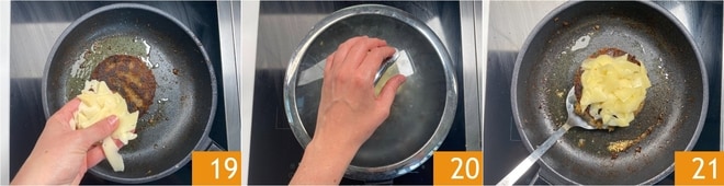 Cozinhe por 3-4 minutos em fogo médio, depois vire-o delicadamente e adicione as pétalas de fontina 19. Cubra com a tampa e deixe cozinhar por mais alguns minutos 20. Quando o queijo derreter, retire o burger da frigideira 21 e proceda dessa forma para cozinhar os outros.