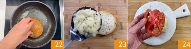 Antes de montar seus pães, você pode aquecê-los colocando a parte cortada na mesma frigideira onde você cozinhou os medalhões, para que absorvam o fundo de cozimento 22. Neste ponto, você pode posicionar o burger de cogumelos com queijo na base do pão 23, depois adicionar uma fatia de tomate 24.