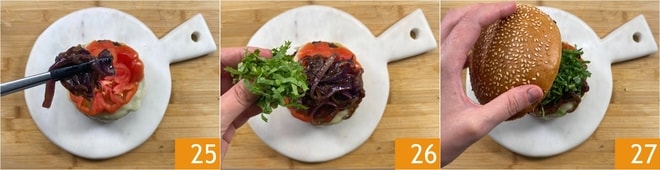 Complete com as cebolas caramelizadas 25 e chicória em julienne 26. Cubra com a outra metade do pão 27 e prossiga dessa forma para montar os outros. Seu burger de cogumelos está pronto para ser saboreado!
