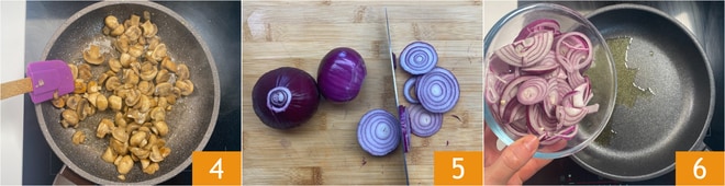 Doure os cogumelos em fogo médio por cerca de 10 minutos, mexendo frequentemente, depois desligue o fogo e deixe esfriar um pouco 4. Enquanto isso, limpe as cebolas e corte-as em rodelas finas 5. Coloque as cebolas em uma frigideira com o azeite quente 6.