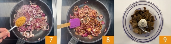 Adicione o açúcar mascavo 7 e cozinhe em fogo médio por cerca de 5 minutos 8. Reserve as cebolas caramelizadas e transfira os cogumelos ligeiramente resfriados para um processador 9.