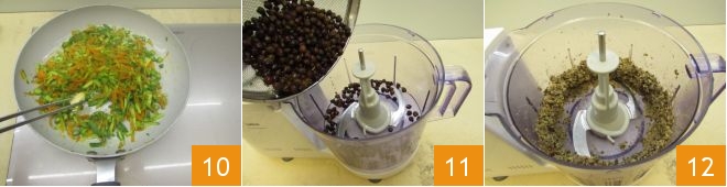 Depois de cozidos, retire o dente de alho 10 e deixe os legumes amornarem. Nesse momento o grão-de-bico estará frio: coloque-o no copo do mixer 11 e processe até reduzi-lo a pó 12.
