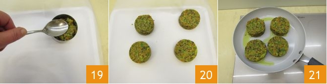 Usando as costas de uma colher, pressione a massa 19 para compactá-la. Repita a mesma operação até formar todos os 4 hambúrgueres vegetarianos. A seguir, aqueça uma frigideira, adicione a quantidade de óleo restante e use-a para cozinhar os burgers. Uma vez posicionados 21, espere cerca de 2-3 minutos até que se forme uma casquinha dourada.