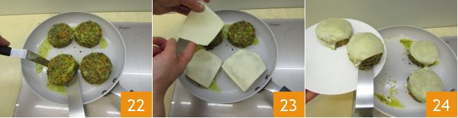 Só então você poderá virá-los, usando duas conchas 22, e finalizar o cozimento do outro lado por mais 2 minutos. Ao virá-los, coloque uma fatia de queijo sobre cada burger 23, assim o queijo vai derreter na medida certa. Quando estiverem cozidos, transfira os burgers para um prato 24.
