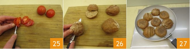 Fatie os tomates 25, depois pegue os pães, corte-os ao meio 26 e aqueça-os por alguns instantes na frigideira, apenas o tempo de deixá-los mais crocantes, com a parte do miolo voltada para baixo 27.