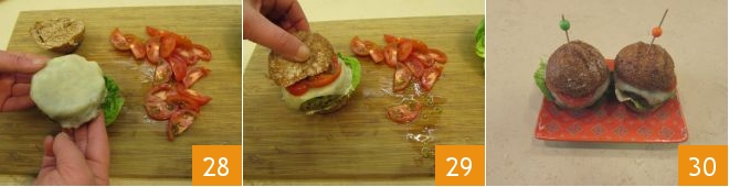 Agora só falta montar seu hambúrguer vegetariano: coloque uma folha de alface no fundo do pão, em seguida posicione o hambúrguer vegetariano 28, as fatias de tomate, salando levemente, e feche com a tampa do pão 29. Sirva seus hambúrgueres vegetarianos 30 ainda quentes para aproveitar plenamente o sabor!