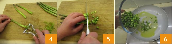 Enquanto isso, cuide dos aspargos. Primeiro corte a parte final, que seria fibrosa, depois descasque-os 4 e corte em rodelas 5; você pode usar a casca para preparar um caldo de legumes rico em minerais. Em uma frigideira, coloque cerca de 20 g de óleo, adicione um dente de alho e deixe dourar. Em seguida, adicione os aspargos 6, abaixe o fogo e deixe cozinhar por 5-6 minutos em fogo baixo.