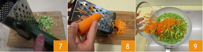 Enquanto os aspargos cozinham, rale a abobrinha 7 e a cenoura, descascada e aparada anteriormente 8, usando um ralador de furos grandes. Decorridos os 6 minutos de cozimento dos aspargos, acrescente na frigideira também as cenouras e as abobrinhas 9. Tempere com sal e pimenta e deixe cozinhar por mais 7-8 minutos até que os legumes fiquem bem macios.