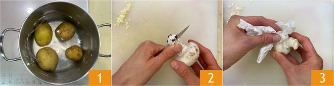 Para preparar o hambúrguer vegetariano de outono, primeiro cozinhe as batatas começando com água fria por cerca de 30 minutos a partir da fervura, ou até que estejam macias o suficiente para serem perfuradas facilmente com um garfo 1. Enquanto isso, pique o alho 1, depois passe para a limpeza dos cogumelos: remova a base 2 e esfregue delicadamente com papel toalha umedecido 3.