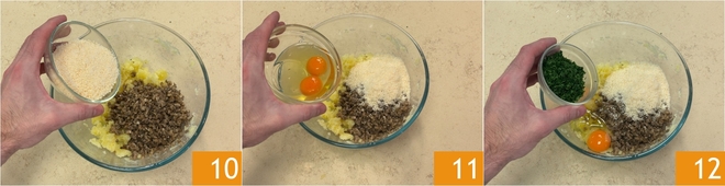 Adicione também o queijo ralado 10, os ovos 11 e a salsinha picada 12.