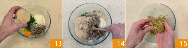 Por último, adicione a farinha de rosca e ajuste o sal e a pimenta 13. Misture bem para integrar tudo 14 e divida a mistura em 4 porções 15. Amasse-as entre as palmas das mãos para formar os hambúrgueres.