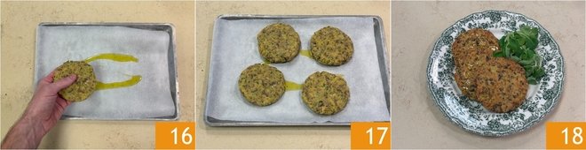 Transfira os hambúrgueres para uma assadeira forrada com papel manteiga levemente untado com azeite 16, depois tempere também a superfície e asse em forno estático pré-aquecido a 200° por cerca de 20 minutos 17. Os seus hambúrgueres vegetarianos de outono estão prontos para serem saboreados 18!