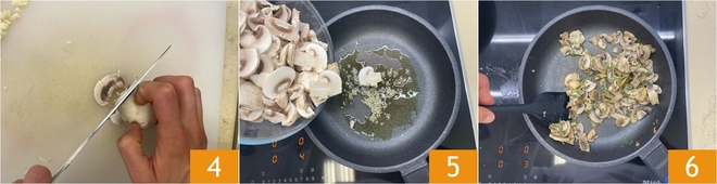 Corte os champignons em fatias finas 4 e vá para o fogão. Em uma frigideira, aqueça um fio de azeite com o alho, depois adicione os cogumelos 5 e uma pitada de sal. Aromatize com a salsinha picada e salteie os cogumelos por cerca de 5 minutos. Uma vez cozidos, pique os cogumelos com uma faca.