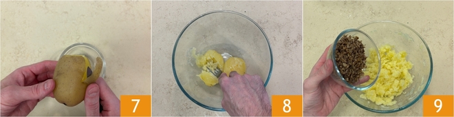 Nesse ponto, as batatas estarão cozidas: descasque-as 7 e amasse-as em uma tigela 8. Junte os cogumelos picados com a faca 9.