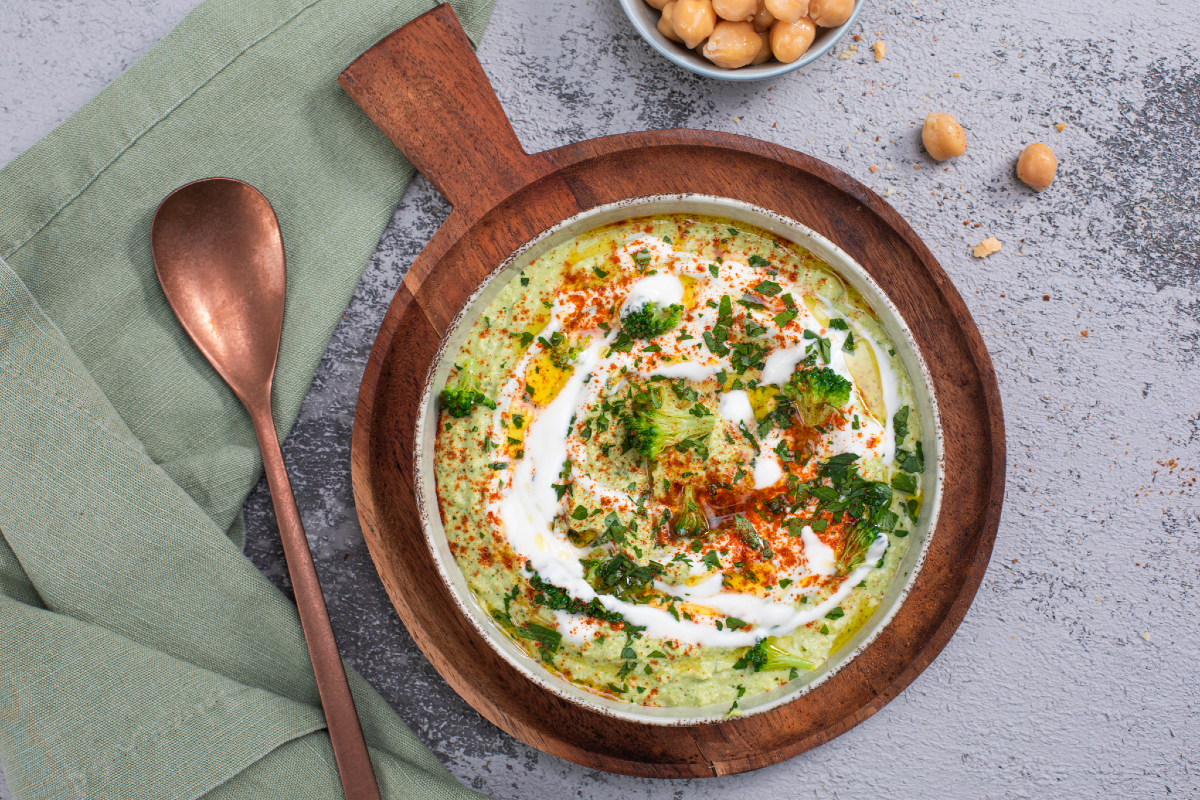 Homus de brócolis temperado e iogurte
