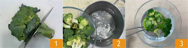 Para preparar o homus de brócolis temperado e iogurte, primeiro limpe o brócolis: você deve obter cerca de 300 g de floretes 1. Ferva os floretes em água salgada por cerca de 5 minutos 2, depois escorra-os em uma tigela com água fria e gelo 3; assim você interromperá o cozimento e a cor permanecerá brilhante.