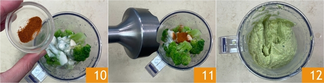 Por fim, tempere com a páprica 10 e bata 11 até obter uma consistência lisa e homogênea 12.