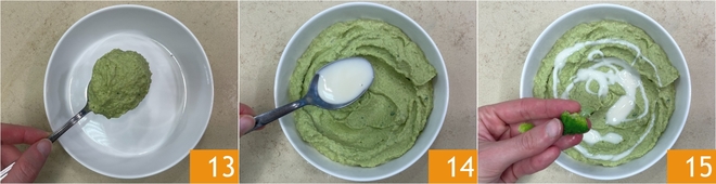 Transfira o composto para uma tigela de servir 13 e decore com o iogurte restante 14 e os floretes reservados 15.