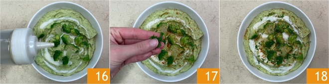 Complete com um fio de azeite 16, uma pitada de páprica e algumas folhinhas de salsinha 17. O seu homus de brócolis temperado e iogurte está pronto para ser servido 18!