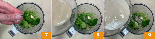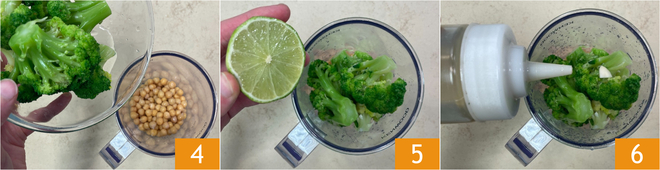 Despeje o grão-de-bico escorrido no copo do processador, depois adicione quase todos os brócolis, reservando alguns para a decoração 4. Adicione o suco de limão 5, o alho e o azeite 6.