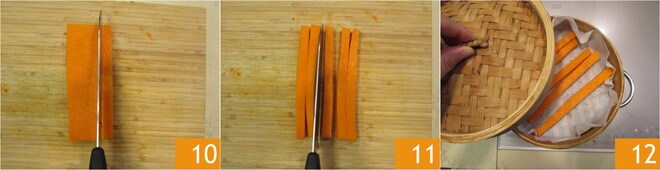 Enquanto isso, corte a abóbora de forma a obter 4 retângulos de 21 cm de comprimento e com largura e altura de cerca de 1 cm 10 11. Coloque os retângulos de abóbora na mesma panela a vapor e deixe cozinhar por 7 minutos 12.