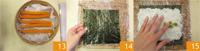 Após o cozimento, deixe a abóbora esfriar 13. Neste ponto, posicione a alga sobre o tapete específico 14 para sushi e distribua por cima o arroz, cuidando para chegar até a borda do lado curto e deixar aproximadamente 1 cm de espaço em ambos os lados longos, achatando bem com as mãos. No centro, espalhe com o dedo uma faixa de wasabi 15.