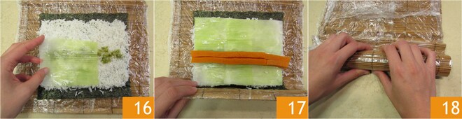 Coloque em toda a superfície do arroz 4 folhas de alho-poró 16 e, em seguida, posicione no centro 2 retângulos de abóbora 17. Agora enrole seu hosomaki começando de baixo, aperte bem com as mãos até que o rolo esteja bem compacto 18.