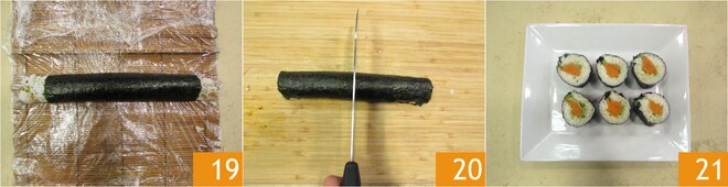 Neste ponto 19 transfira-o para uma tábua de cortar e corte-o primeiro ao meio e depois em 6 pedaços 20. Seu hosomaki vegetariano está pronto para ser servido, se desejar, com molho de soja 21.