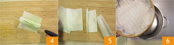 Corte o alho-poró com a faca no sentido do comprimento 4 e separe as folhas 5. Prepare uma panela a vapor com cesto forrado com papel manteiga 6.