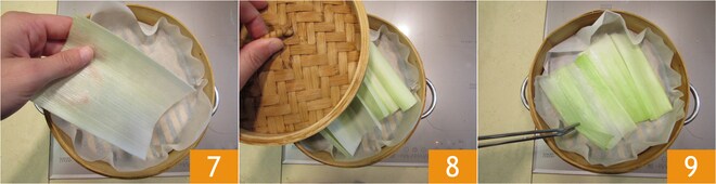 Coloque aqui as folhas de alho-poró 7 e cozinhe por 5 minutos com tampa 8. Depois de cozidos 9, transfira-os para um prato para esfriar.