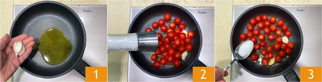 Para preparar o hummus de tomatinhos, a primeira coisa a fazer é lavar bem os tomatinhos. Em uma frigideira, coloque um fio de óleo e adicione os dentes de alho com casca 1. Tempere com sal 2 e açúcar 3.