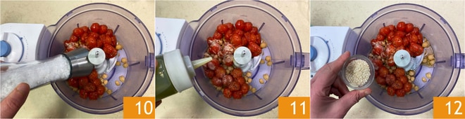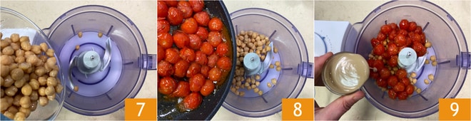 No processador, coloque os grãos-de-bico pré-cozidos 7, os tomatinhos 8 e a tahine 9.