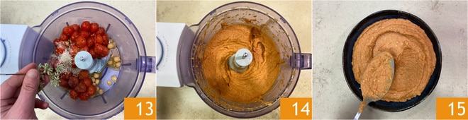 Por fim, adicione o orégano seco 13 e bata até obter um creme liso e homogêneo 14. Transfira o hummus de tomatinhos para uma tigelinha 15.