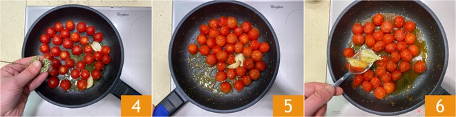 Adicione o orégano seco 4 e cozinhe por 5-6 minutos 5, em seguida, retire o alho 6 e reserve alguns tomatinhos para a decoração final.