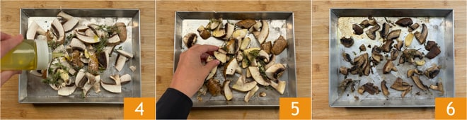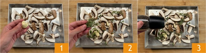 Para preparar o hummus de cogumelos, primeiro Como limpar os cogumelos porcini com um pano úmido, removendo os resíduos de terra. Corte-os em fatias grosseiramente e depois ao meio. Coloque-os em uma assadeira e adicione o alho 1, a manjerona, o tomilho 2, sal e pimenta 3.