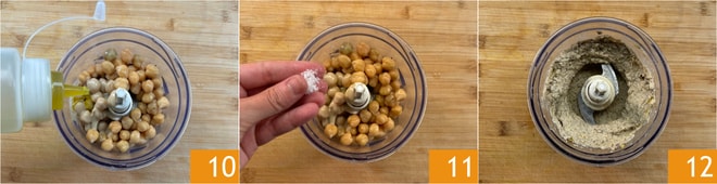 Despeje um fio de azeite 10 e ajuste o sal 11. Bata até obter um creme homogêneo 12.