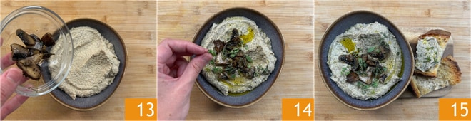 Transfira tudo para uma tigela e decore com os cogumelos reservados 13. Adicione pimenta, um fio de azeite, algumas folhas de tomilho e manjerona 14. Seu hummus de cogumelos está pronto para ser servido, talvez acompanhado de bruschettas de pão 15.