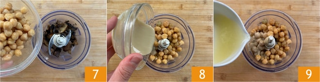 Coloque os cogumelos no liquidificador, separe uma colher para a decoração final. Adicione o grão-de-bico 7, a tahine 8 e o suco de limão 9.
