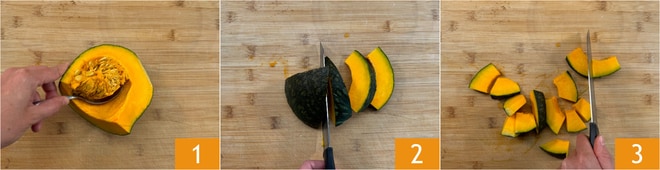 Para preparar o hummus de abóbora, primeiro retire as sementes e os filamentos internos da abóbora 1. Corte-a em fatias de 1-2 cm 2 e depois corte as fatias ao meio 3. É importante que sejam do mesmo tamanho para obter uma cocção uniforme.