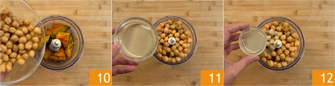 Transfira a abóbora para um mixer e adicione o grão-de-bico 10, a tahine 11 e o suco de limão 12.