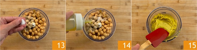 Tempere com uma pitada de sal 13 e um bom fio de óleo 14. Bata até obter uma mistura homogênea, lisa e com consistência amanteigada 15. Se ficar muito denso, você pode adicionar um pouco de água ou um cubo de gelo e bater por alguns segundos.