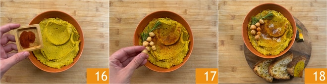 Transfira tudo para uma tigela e decore com páprica 16, pimenta, alecrim, grão-de-bico 17 e um fio de óleo. Seu hummus de abóbora está pronto para ser saboreado 18, talvez acompanhado de pão torrado.