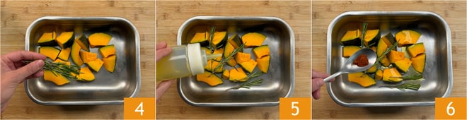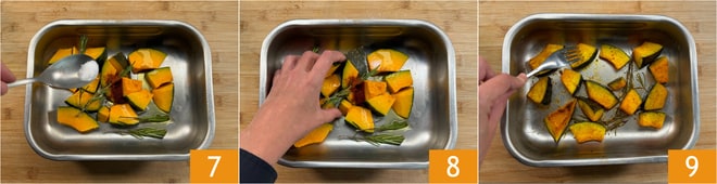 Continue com o sal 7 e massageie os pedaços de abóbora 8 para temperá-los uniformemente. Asse no forno estático a 200°C por 30 minutos. Verifique com um garfo se a abóbora está macia 9.
