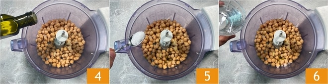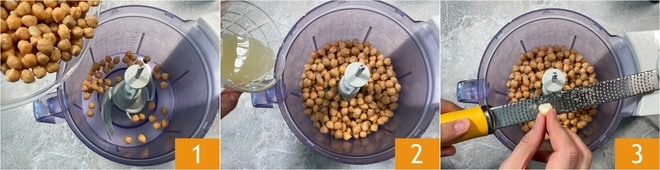 Para preparar o hummus sem tahina, coloque o grão-de-bico cozido e escorrido em um processador 1, em seguida adicione o suco de limão 2 e rale um dente de alho 3.