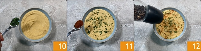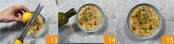 Aromatize com a casca de limão 13 e finalize com um fio de azeite 14. O seu hummus sem tahina está pronto para ser servido 15!