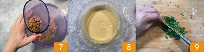 Feche o processador 7 e bata até obter uma consistência cremosa 8. Se ainda estiver granuloso, adicione um pouco de água de cada vez. Agora, cuide da decoração: pique finamente a salsinha 9.