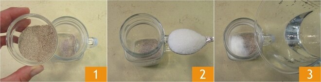 Para preparar o iced ginseng com caramelo, despeje o café de ginseng solúvel em uma jarra 1 junto com uma colher de chá de açúcar 2 e a água quente 3.